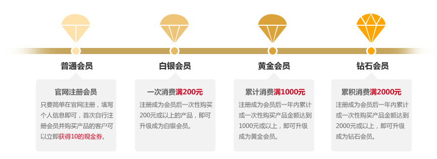 佰花方分別有四個(gè)等級,即普通會(huì)員、白銀會(huì)員、黃金會(huì)員、鉆石會(huì)員: